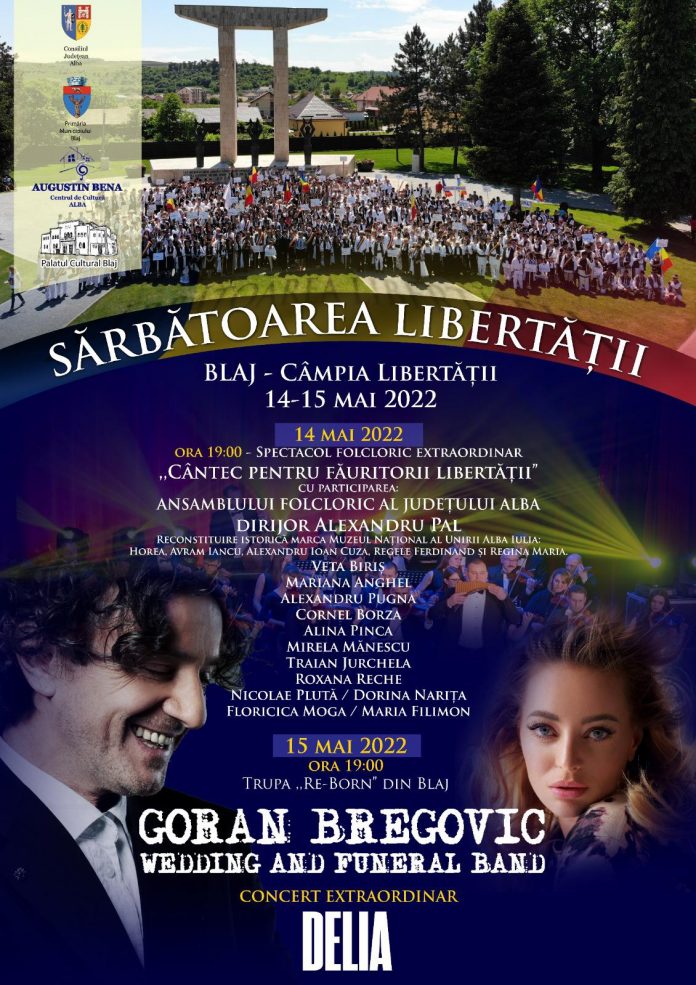 Consiliul Județean Alba, Centrul de Cultură „Augustin Bena” și Primăria Municipiului Blaj organizează, sâmbătă și duminică, 14 – 15 mai 2022, Sărbătoarea Libertății, un proiect cultural dedicat unuia dintre cele mai importante momente din istoria românilor: Adunarea Națională de la Blaj. Evenimentele vor îmbina folclorul tradițional românesc, din prima zi, cu recitaluri susținute de Goran Bregovic și Delia, în a doua zi.