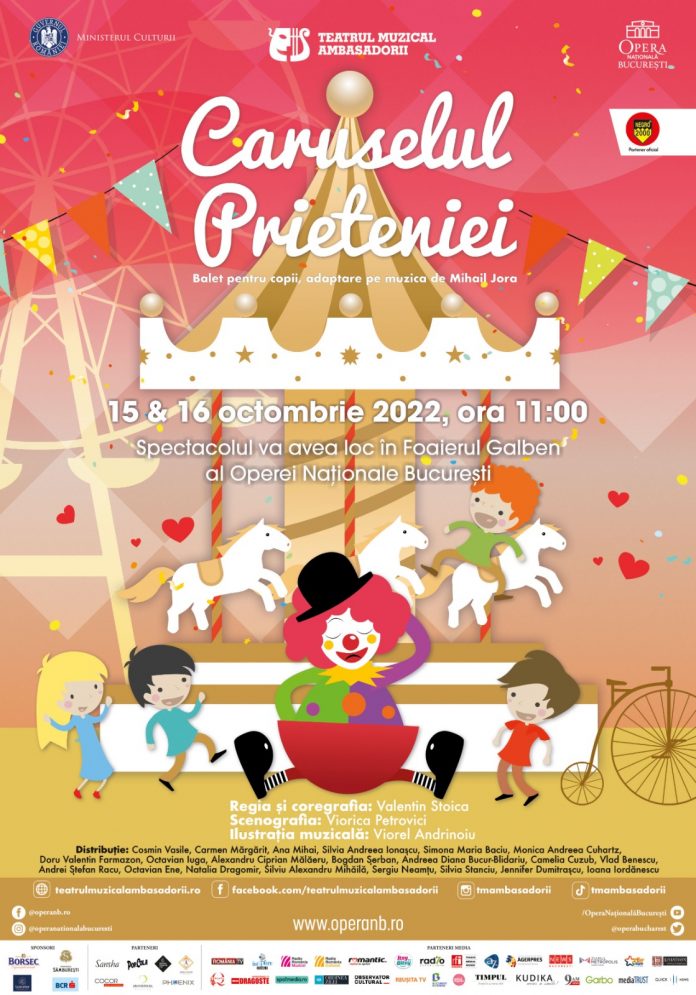 Teatrul Muzical Ambasadorii în parteneriat cu Opera Națională București prezintă sâmbătă, 15 octombrie, și duminică, 16 octombrie, începând cu ora 11:00, spectacolul pentru copii „Caruselul Prieteniei” adaptare pe muzică de Mihail Jora. Spectacolul avea loc în Foaierul Operei Naționale București. Într-un București interbelic, piața circului este invadată de bâlciul verii, aici îi regăsim pe vânzătorii ambulanți de dulciuri, jucării și alte atracții pentru copii. Povestea se aprinde odată cu momentul apariției copiilor năzdrăvani care strică dispoziția pieței, dar mai ales pe cea a clovnului adormit, mereu rămas în urma timpului. El devine ușor marioneta preferata a grupului răutăcios de copii, care pune la cale sabotarea spectacolului de circ. Locul preferat de întâlnire al grupului rămâne caruselul, aici se pun mereu la cale planurile de peste zi. Pentru ca povestea să nu rămână incompletă, printre răutăcioși apare dragostea, Caruselistul și Chiva, doi tineri naivi, uniți prin dragoste la prima vedere. Grupurile copiilor se separă din cauza neînțelegerilor, conflictul se amplifică în momentul în care în rândul copiilor apare atașamentul față de cele petrecute la circ. Băieții și fetele nu se mai înțeleg, țelurile comune se despart, băieții aleg răzbunarea și răutatea gratuită, iar fetele reconcilierea. Rămași afară din cortul circului, chiar înaintea începerii spectacolului, grupul de băieți resimte gustul destrămării prieteniei, lucru care îi va transforma în cele din urmă și îi va aduce din nou împreună pentru mai multe aventuri. Circul simbolizează copilăria și puritatea ei, sub cupola circului, caruselul se învârte înțesat cu amintiri.