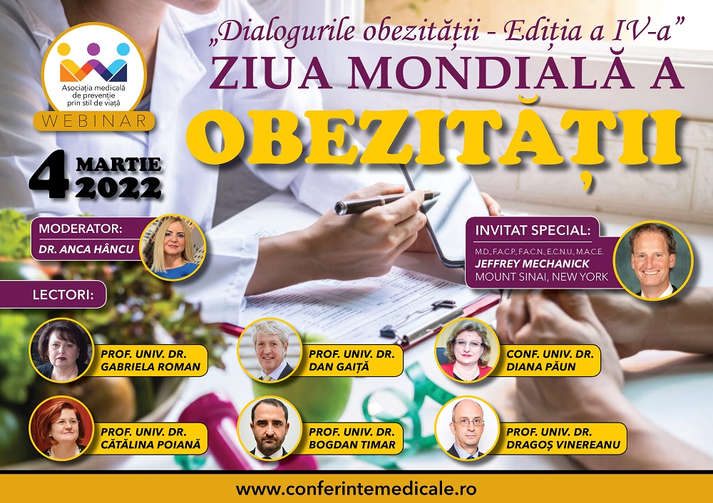 Asociația medicală de prevenție prin stil de viață organizează, cu ocazia Zilei Mondiale Luptă Împotriva Obezității – 4 martie 2022, cea de-a patra ediție a evenimentului Dialogurile Obezității, o conferință dedicată profesioniștilor în domeniul sănătății, cu scopul de a crește gradul de educație medicală cu privire la diagnosticul și îngrijirea persoanelor cu obezitate. Creditată cu puncte de formare continuă, conferința medicală se bucură de prezența unor medici și specialiști voci importante la nivel național în managementul bolilor de nutriție, dar mai ales de participarea extraordinară a M.D. Jeffrey Mechanick, de la Mount Sinai, New York, profesor specializat în boli endocrinologice (Medical Director, The Marie-Josee and Henry R. Kravis Center for Cardiovascular Health at Mount Sinai Heart; Director, Metabolic Support, Division of Endocrinology, Diabetes and Bone Disease Icahn School of Medicine at Mount Sinai).