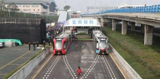 Chinezii au lansat trenul fără șine, care rulează pe linii vopsite...
