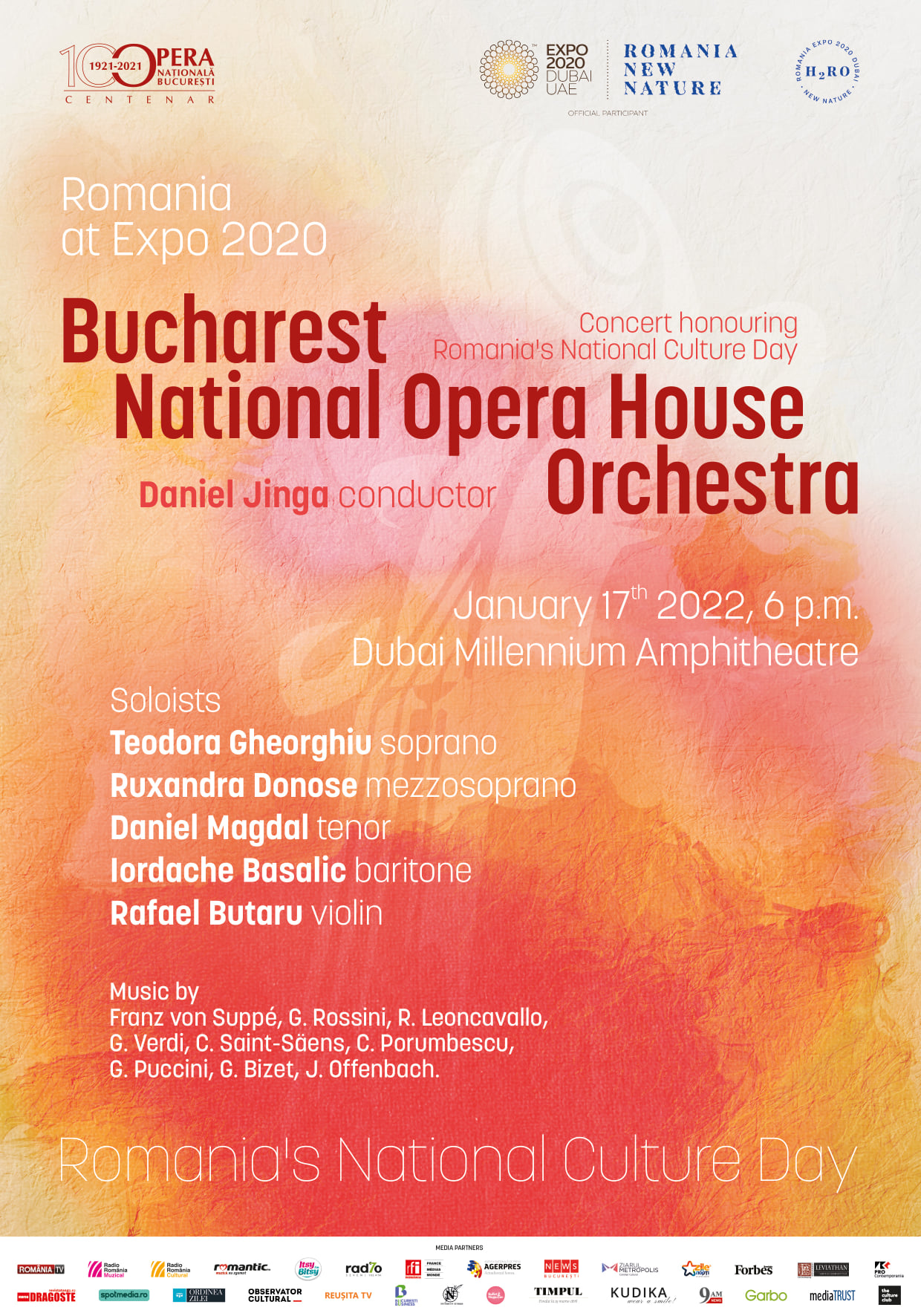 Cu ocazia Zilei Culturii Naţionale, renumitele voci ale sopranei Teodora Gheorghiu şi mezzosopranei Ruxandra Donose, alături de soliștii Operei Naționale București, tenorul Daniel Magdal și baritonul Iordache Basalic, urmează a încânta publicul prezent la Expo 2020, invitând-l să păşească alături de artiştii Operei Naţionale din Bucureşti într-o lume învăluită de mister, dramă și dragoste. Pentru a pune în valoare cultura română în contextul cosmopolit de la Expo 2020, virtuozul violonist Rafael Butaru va interpreta „Balada” pentru vioară și orchestră de Ciprian Porumbescu, una dintre cele mai cunoscute lucrări româneşti la nivel internaţional. În data de 18 ianuarie, formaţii camerale din cadrul Orchestrei Operei Naţionale din Bucureşti vor susţine micro-recitaluri în pavilionul României la Expo 2020.