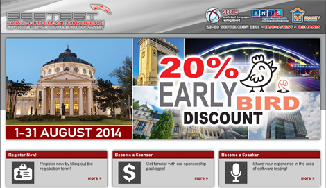 Pe 25 si 26 septembrie, Hotel Crowne Plaza gazduieste cea de a treia editie a conferintei de testare de software din Europa de Sud-Est (SEETEST 2014), organizata de South East European Testing Board in colaborare cu Asociatia Patronala a Industriei de Software si Servicii (ANIS) si Quality House. Biletele early bird sunt disponibile pana la data de 31 august si pot fi achizitionate online la http://seetest.org/index.php?page=registration.