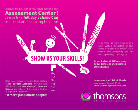 Thomsons Online Benefits, unul dintre liderii de pe piata furnizorilor de software pentru pachete de beneficii pentru angajati, la nivel mondial, anunta lansarea unui program creativ de recrutare de tip centru de evaluare (Assessment Center) pe 13 martie. in urma acestuia, 10 dintre participanti vor deveni angajati in cadrul echipei Thomsons Cluj, in departamentul Helpdesk.