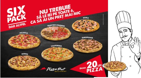 București, 27.09.2016. În această toamnă, Pizza Hut Delivery își surprinde clienții cu oferta Six Pack, dar altfel, prin care aceștia pot beneficia de un preț special la șase rețete de pizza de dimensiune medie, fără a fi nevoiți însă să le comande pe toate cele șase.