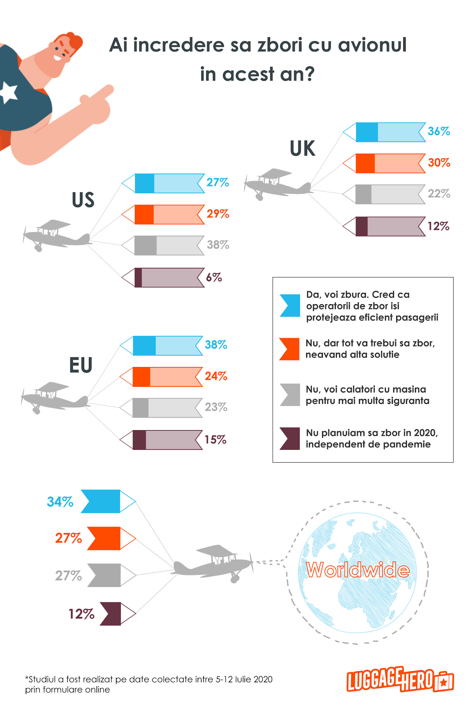 În legătură cu modul în care companiile aeriene ajută în protejarea pasagerilor privind infectarea cu COVID-19, doar aproximativ o treime dintre participanții europeni (38%) au spus că au încredere să călătorească cu avionul. Alți 24% afirmă că nu au de ales, deci vor zbura chiar dacă nu sunt total încrezători în măsurile luate de companiile aeriene. Aproximativ un sfert dintre respondenții europeni (23%) plănuiesc să călătorească folosind mașina personală, pentru mai multă siguranță în timpul pandemiei.