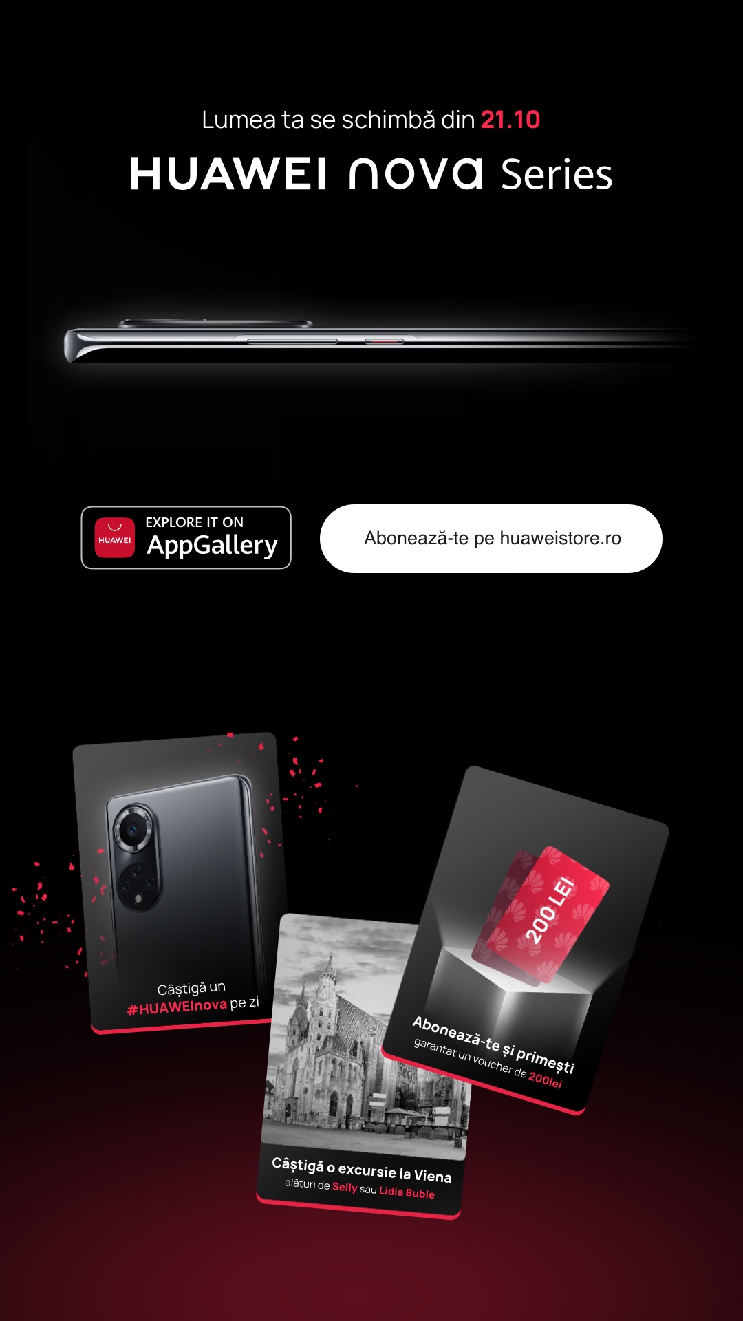 București, 8 octombrie 2021 – Huawei Consumer BG va lansa pe 21 octombrie seria de telefoane Nova. Campania de lansare oferă o multitudine de premii și beneficii pentru consumatori. Astfel, până pe 20 octombrie, cei care intră pe pagina dedicată noului smartphone Huawei și se abonează la newsletter-ul magazinului online pot câștiga un HUAWEI Nova pe zi. Printre premii se mai numără și o excursie la Viena alături de artiștii Lidia Buble sau Selly și un voucher de reducere pentru achiziționarea noului telefon vârf de gamă din seria HUAWEI Nova.