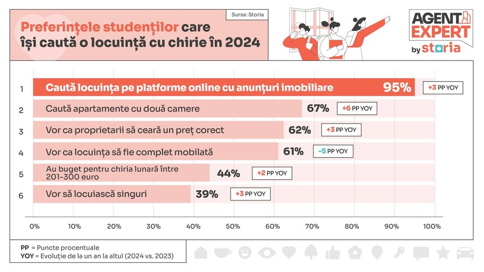 „În perioada august-septembrie vedem în fiecare an o creștere a activității pe piața imobiliară, odată cu începerea anului universitar și cu mutarea studenților în marile orașe. Conform celui mai recent studiu pe care l-am desfășurat, studenții continuă să aibă preferințe similare cu cele de anul trecut: locuințe complet mobilate, cu mobilier modern, curate și cu costuri reduse de întreținere. În plus, aceștia apreciază relațiile transparente și respectuoase cu proprietarii, așteptând un preț corect pentru închiriere, lipsa vizitelor neanunțate și un contract de închiriere clar. Am observat, de asemenea, o tendință de creștere a bugetului disponibil pentru chirie în rândul studenților. Aceștia beneficiază de un sprijin financiar mai consistent din partea părinților, ceea ce poate justifica și dorința mai accentuată de a locui singuri comparativ cu anul precedent”, a declarat Monica Dudău, Senior Marketing Manager Storia & OLX Imobiliare.